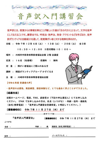 【 応募方法 】 当館ホームページ、電話、FAX、直接窓口(下記の申込書記入)にてお申し込みください。(FAXでお申し込みの方は、氏名(ふりがな)・年齢・住所・連絡先(自宅/携帯電話)・「音声訳入門講習会受講希望」と明記してください。)